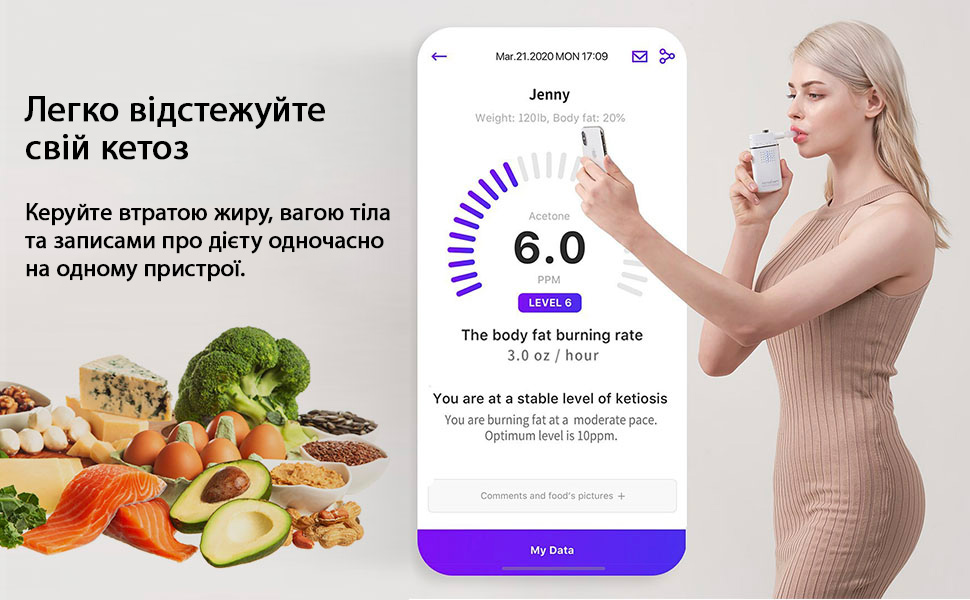Индикатор KETOSCAN Mini анализирует содержание ацетона в выдыхаемом воздухе пользователя. Ацетон является одним из кетоновых тел, уровень которого повышается при эффективном сжигании жира в организме. Для измерения достаточно выдохнуть в устройство в течение 3 секунд, после чего оно мгновенно покажет результат в частях на миллион (PPM).