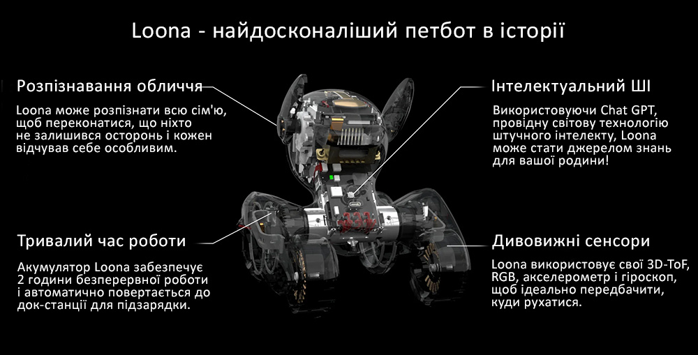 - Искусственный интеллект. Благодаря интеграции ChatGPT, Loona может поддерживать диалог, отвечать на вопросы и адаптироваться к индивидуальным предпочтениям пользователей. Это делает его не только забавным, но и образовательным устройством.