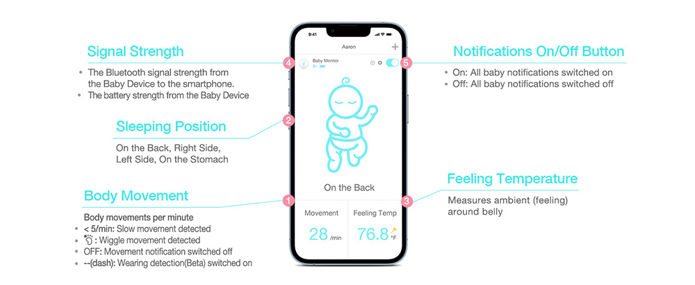 Прибор выполнен в корпусе из прочного экологически безопасного пластика и имеет набор датчиков, позволяющий автоматически и практически моментально определять момент, когда ребенок нуждается во внимании взрослого. Электроника устройства мониторит и анализирует данные, обращая внимание на повышенную или пониженную температуру, движения, а также положения тела, представляющие опасность для его младенца – например, когда он переворачивается на животик. В последнем случае на смартфон родителей в приложение отправляется сообщение, если ребенок в течение 15 секунд остается лежать на животе. Такой алгоритм дает возможность внимательно следить за качеством сна, не беспокоясь понапрасну из-за того, что младенец ворочается во сне. Наблюдение же за температурой тела позволяет своевременно отреагировать на опасные колебания, определив момент, когда ребенок заболевает, перегрелся или переохладился.