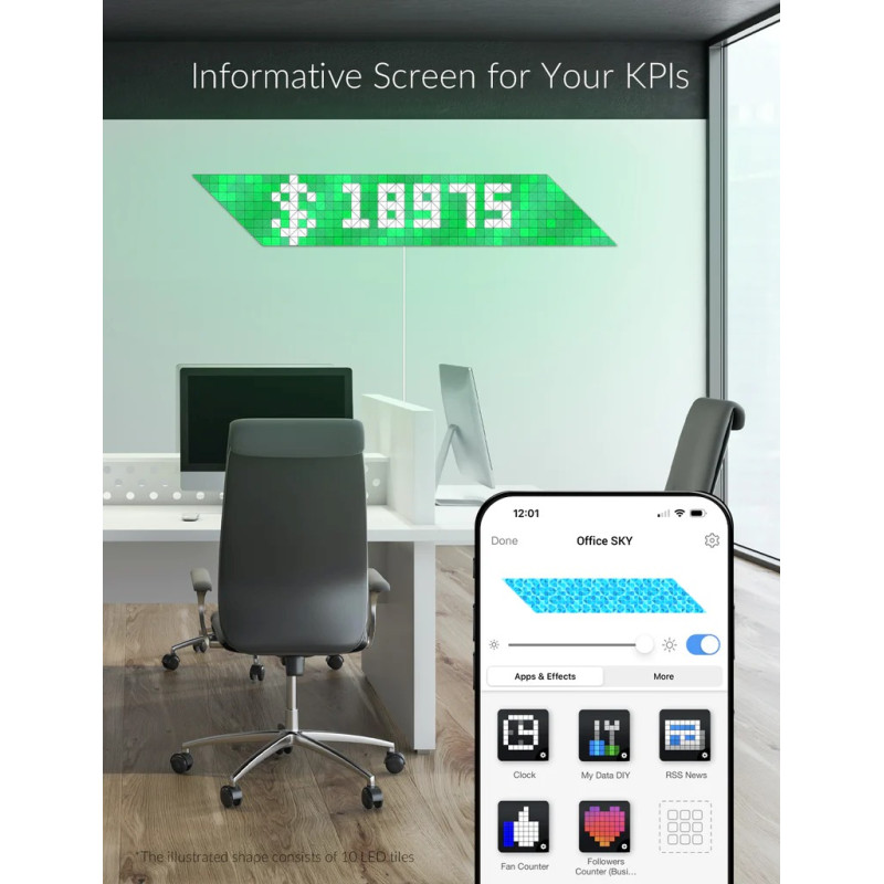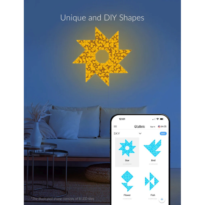Система освітлення LaMetric SKY Starter Kit пропонує унікальні можливості для створення атмосферного освітлення у вашому приміщенні. Чудові мозаїчні поверхні, натхненні склом, дозволяють прикрасити вашу стіну значущими формами та створити захоплюючі візуальні ефекти. Вас вразять незліченні комбінації кольорів завдяки 64 незалежним зонам кольору на кожній плитці.